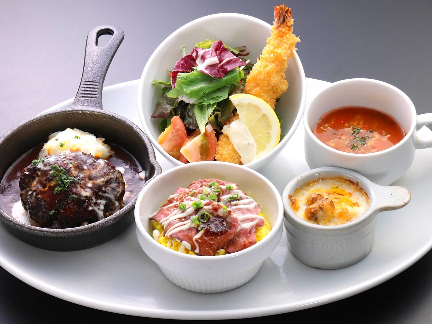 毎日、シェフが手ごね仕込みの特製ハンバーグ、ステーキランチが自慢のランチタイム 。BILLIONの美味しい!が詰まったプレートランチも好評です。